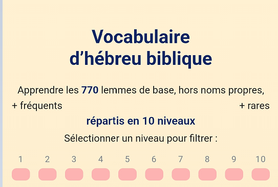 Appli sur Play Store : apprentissage de 770 lemmes de base d'hébreu biblique. Développé par un enseignant des Facultés Loyola Paris