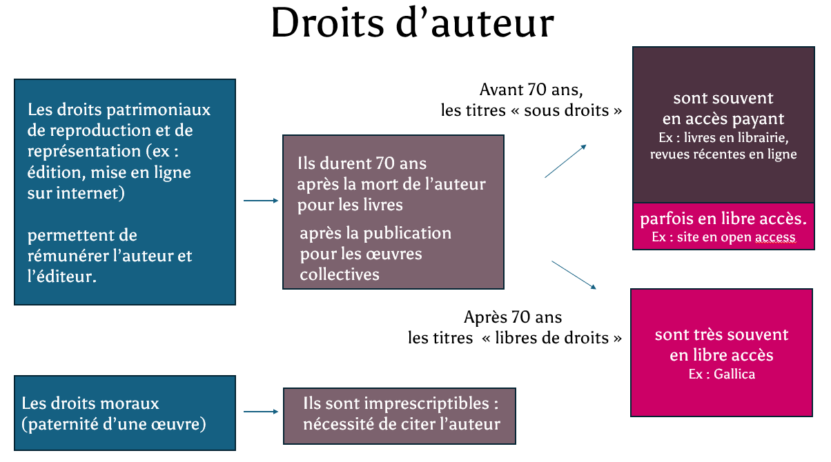 En ligne, les documents anciens sont souvent accessibles ; en revanche, les documents récents sont généralement plus difficiles d'accès sans abonnement : il est donc utile de mieux comprendre le droit d'auteur pour mieux rechercher !